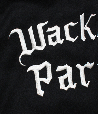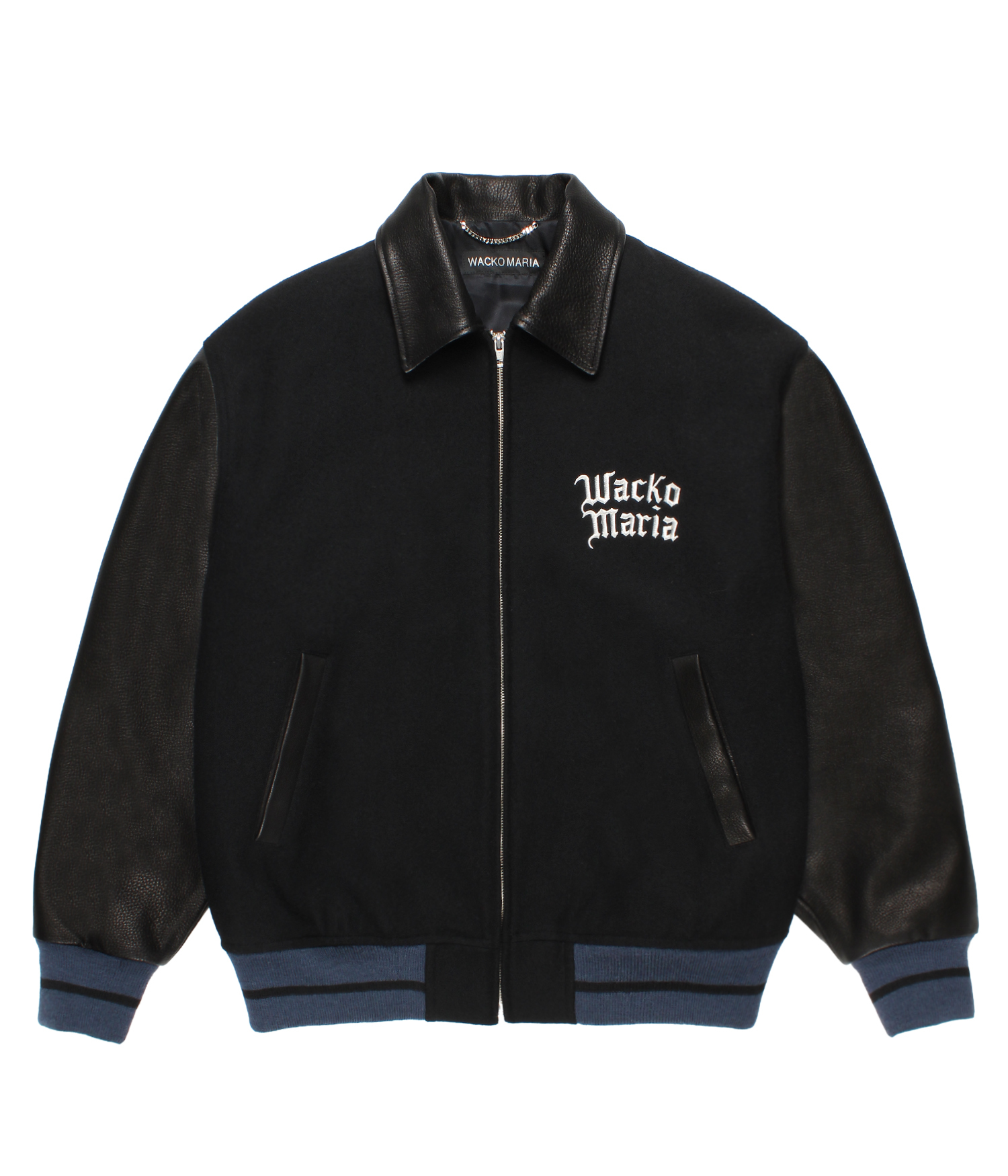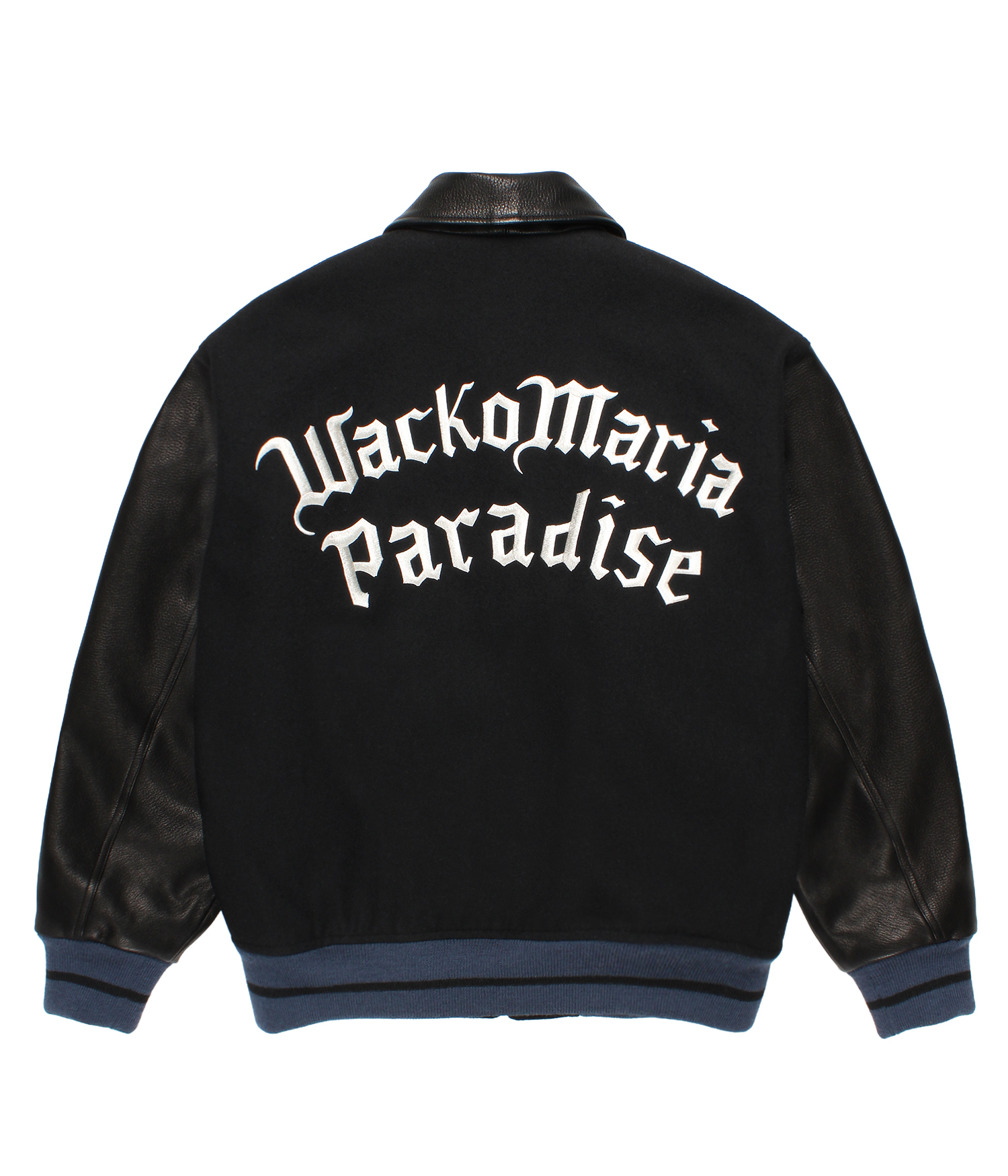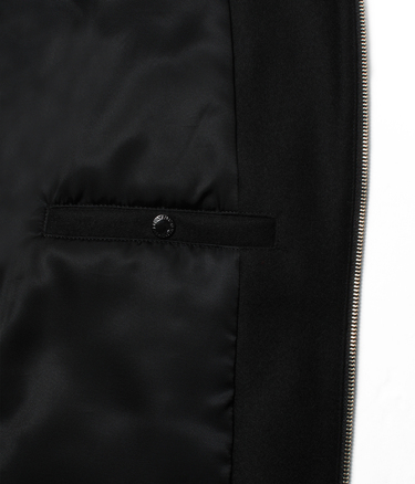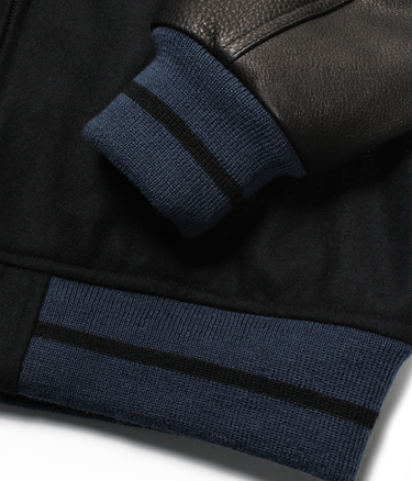 VARSITY JACKET FEATURING COWHIDE LEATHER ON THE COLLAR AND BOTH SLEEVES.